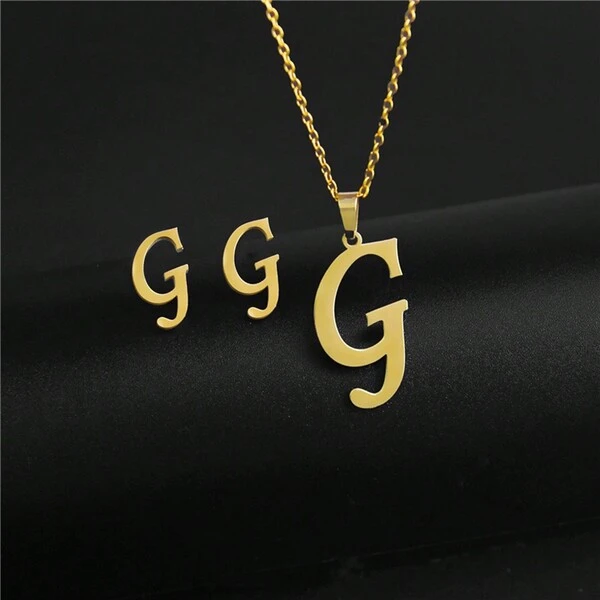 1set European And American Style Stainless Steel 26 Alphabet Pendant Necklace Three-Piece Set, Simple G Letter Pendant, Collarbone Chain Earrings Set, Versatile Sweater Chain, Not Fading Pendant Chain Collarbone Chain Earrings Set