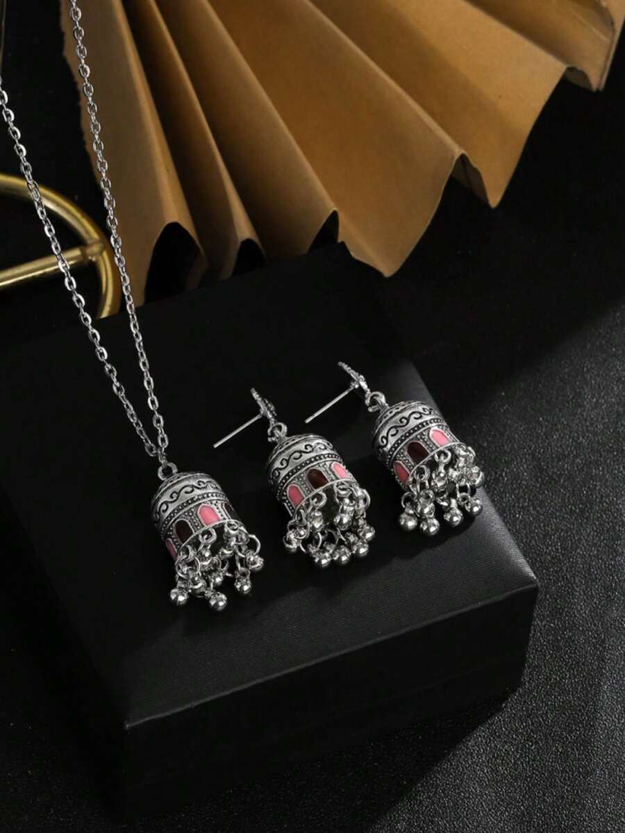 1set Fashionable Colorful Tassel Necklace And Earrings Set With Bell And Oil Drip Design, Suitable For Women'S Daily Wear