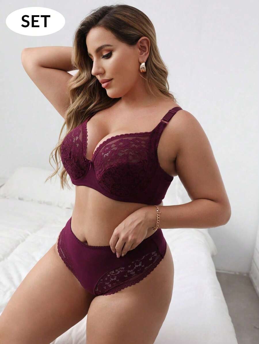 1set Plus Size Women's Solid Color Lace Thin Sponge Lined Underwire Push-up Bra And Thong Set, Sexy Minimalist Style