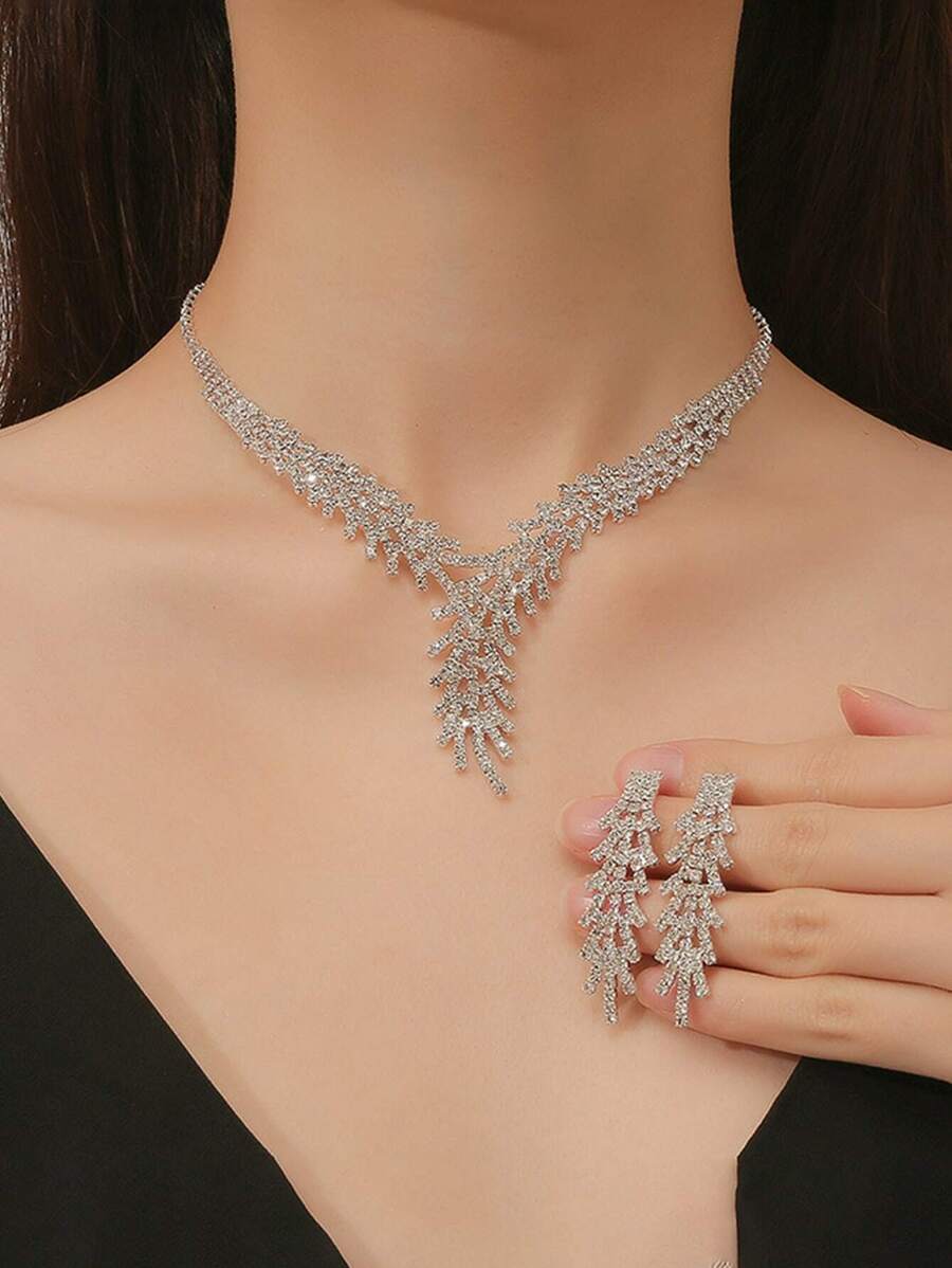 1set Silver-tone Luxurious Bridal Earrings & Necklace Set For Evening Party