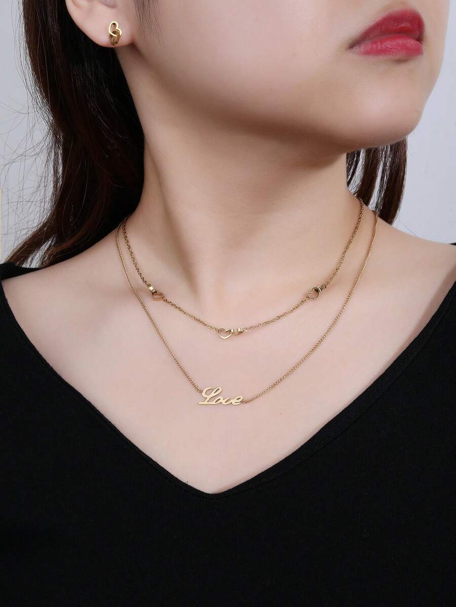 1set Stainless Steel Fashion Love Element Double Layer Necklace & Heart Shaped Stud Earrings