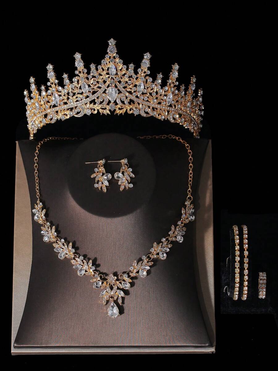 1set Women'S Classic & Elegant Gold Bridal Accessories, Including Crown, Necklace, Earrings, Bracelet, Ring, Suitable For Wedding Dress And Formal Dress, Also For Wedding Party And Banquet