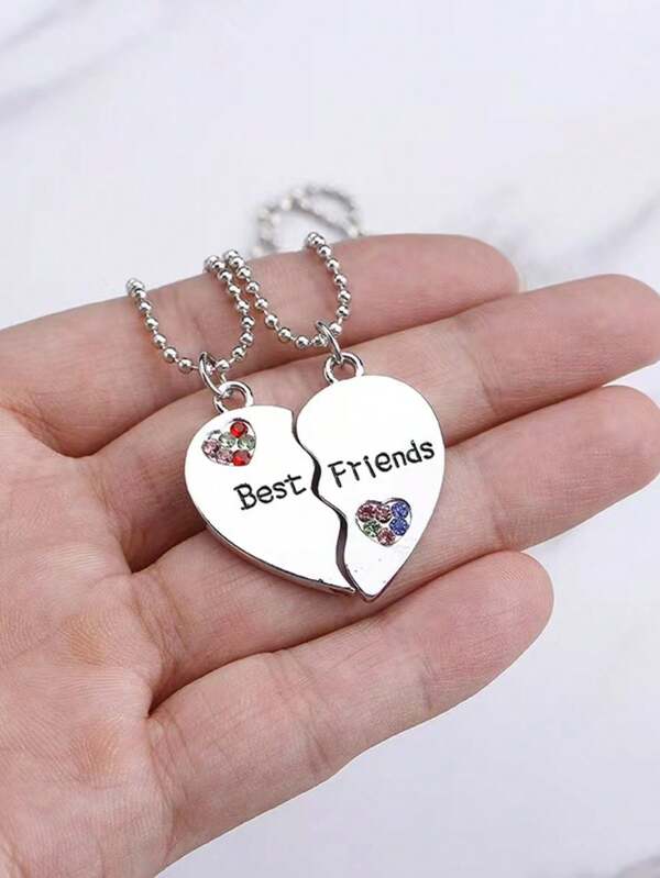 1set/2pcs Couple'S Fashionable Rhinestone Heart-Shaped Necklace