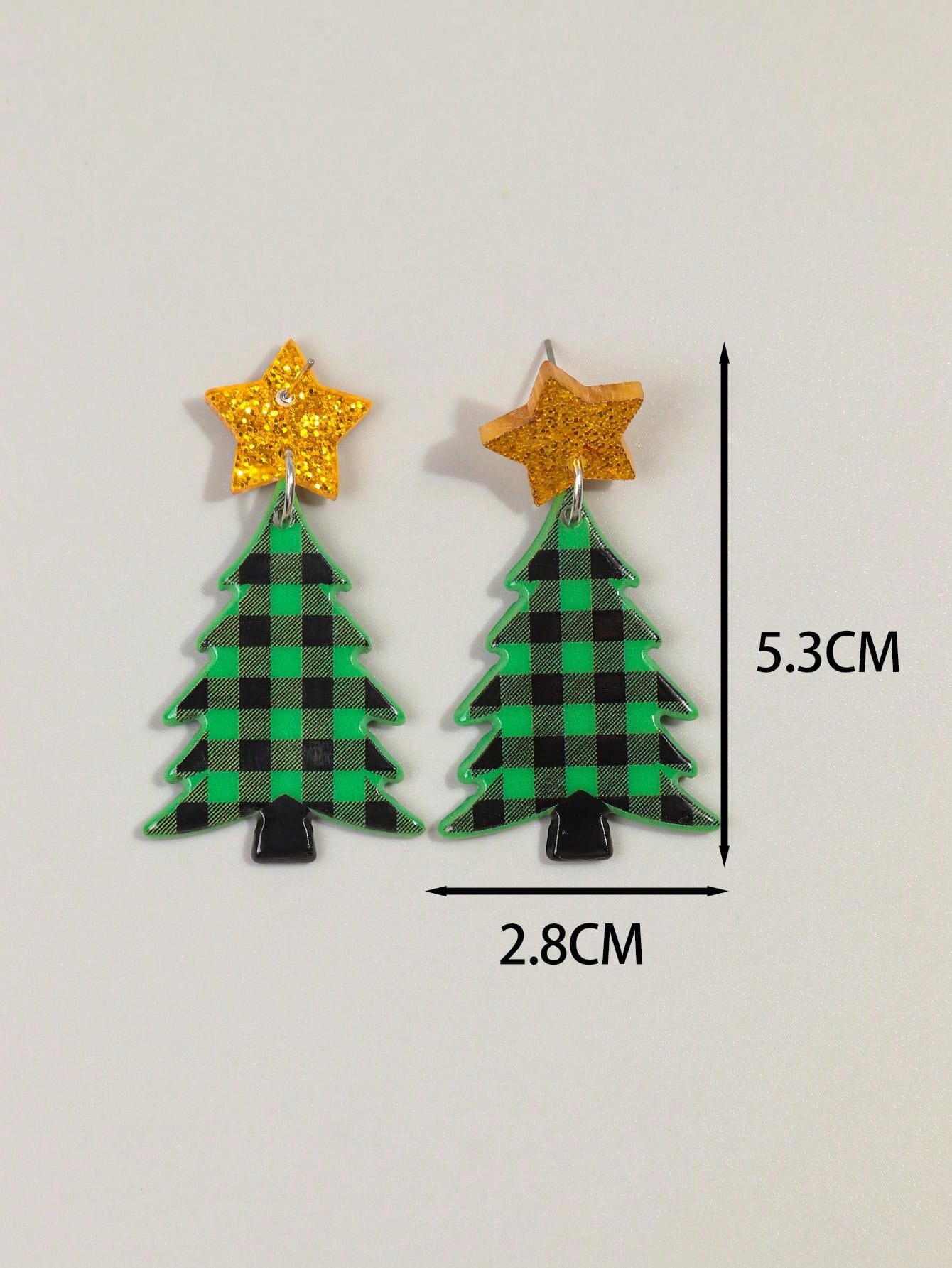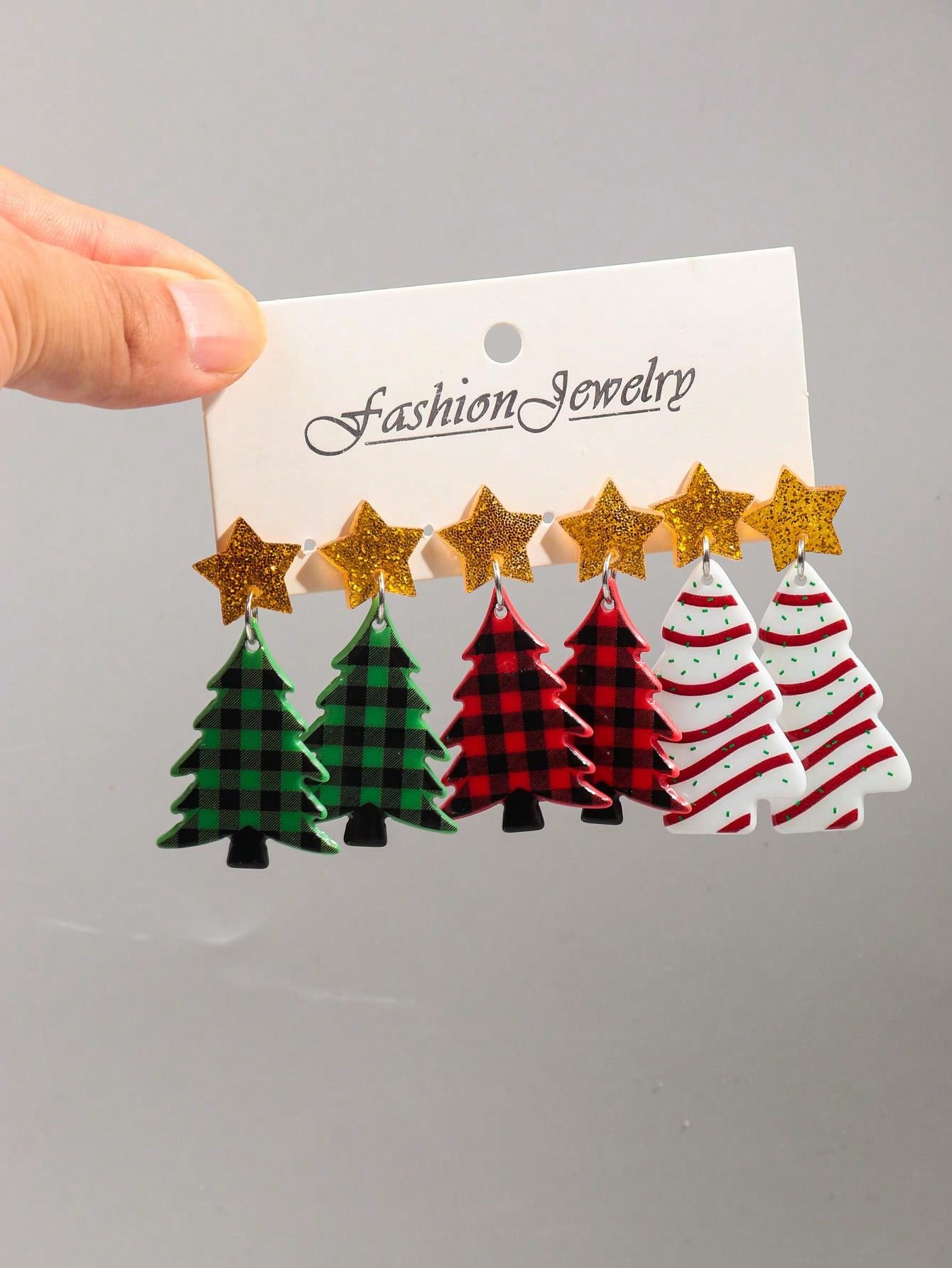 1set/3pairs Acrylic Colorful Grid & Line Print Star & Christmas Tree Design Pendant Earrings Suitable For Women's Festival Wear