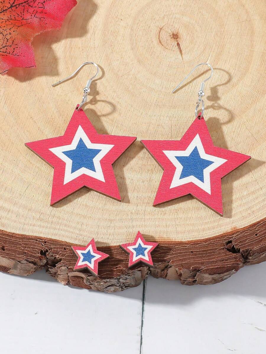 1set/4pcs Fashionable Geometric Pentagram Wooden Earrings For Women, Jewelry, Gifts For Usa Independence Day