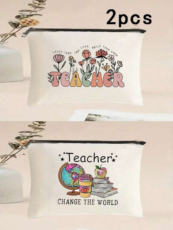 2 Pack Stylish Letter Print Cosmetic Bag, Multifunctional Cosmetic Bag, Multifunctional Zipper Clutch Coin Purse Teacher Thank You Gift Thank You Teacher Cosmetic Bag Cosmetic Bag Graduates Day Cosmetic Bag Cartoon Pattern Cosmetic Bag, Lightweight Portable Gift Bag And Other Functional Cosmetic Bags