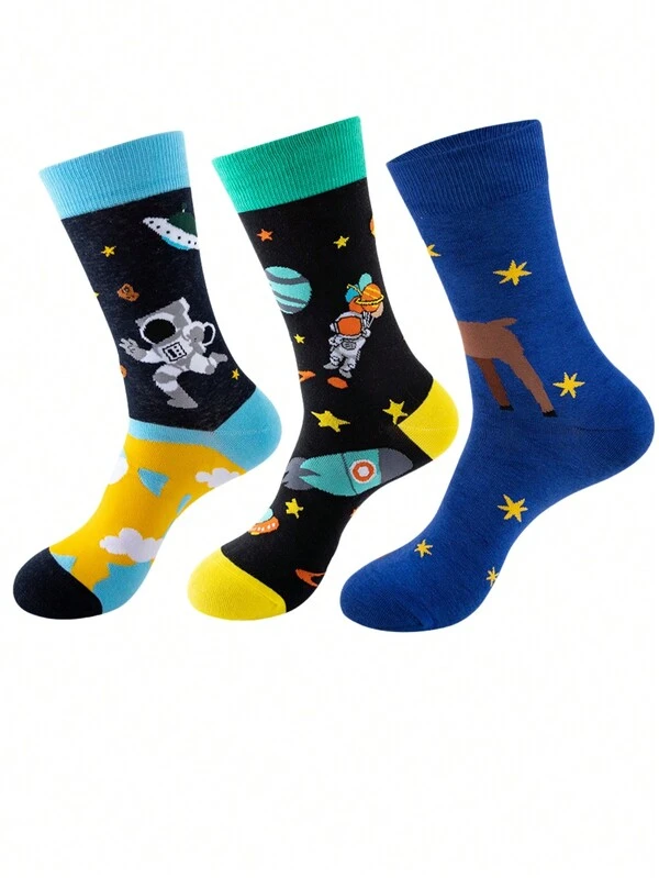 2 Pairs Random Color Women'S Interesting Astronaut Happy Socks, Fashion Street Sports Casual Mid-Calf Socks Suitable For Daily Wear