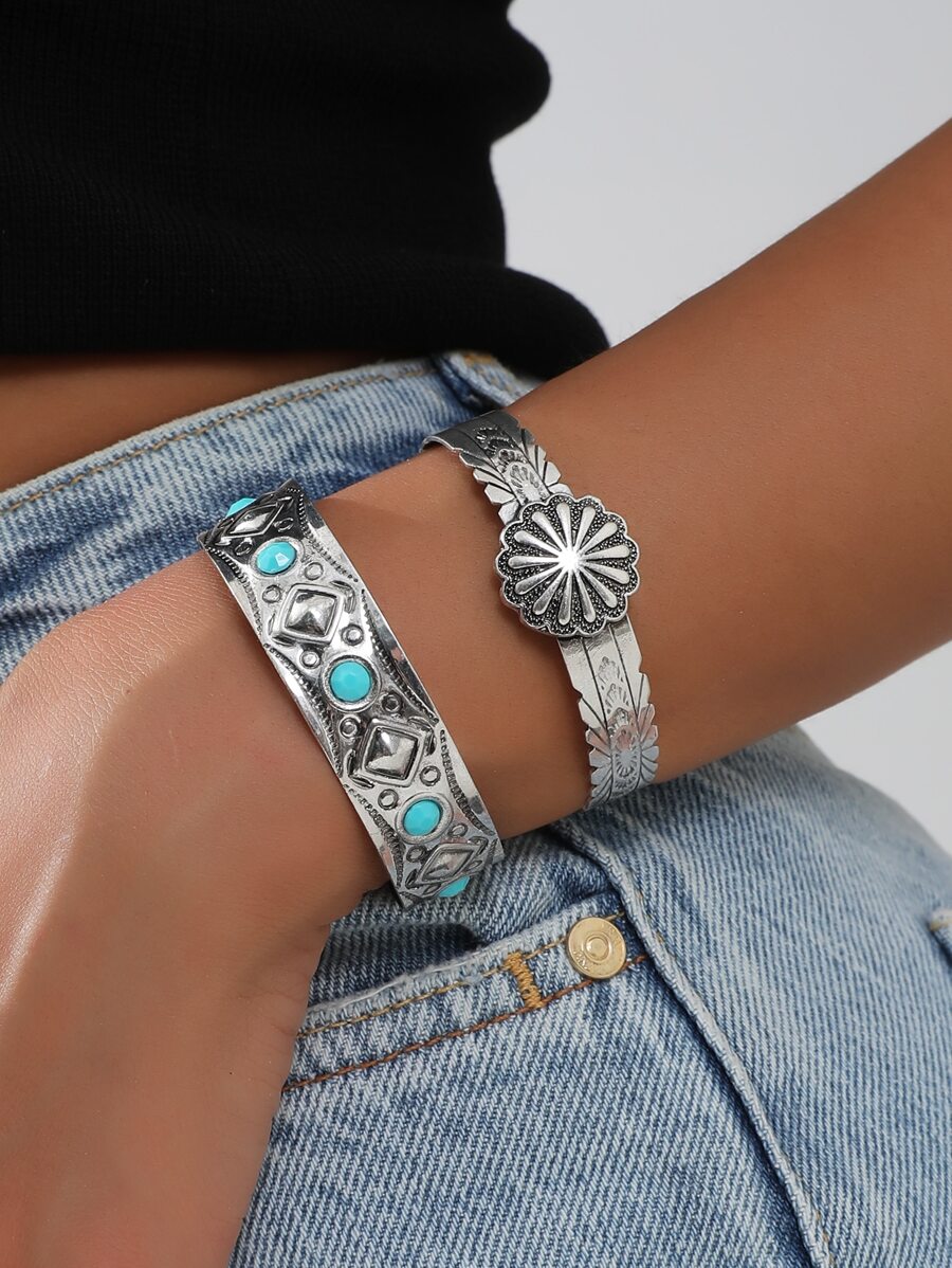 2 Pcs Western Style Antique Silver Color Metal Cuff Bangle Bracelet Set Turquoise Jewelry for Women