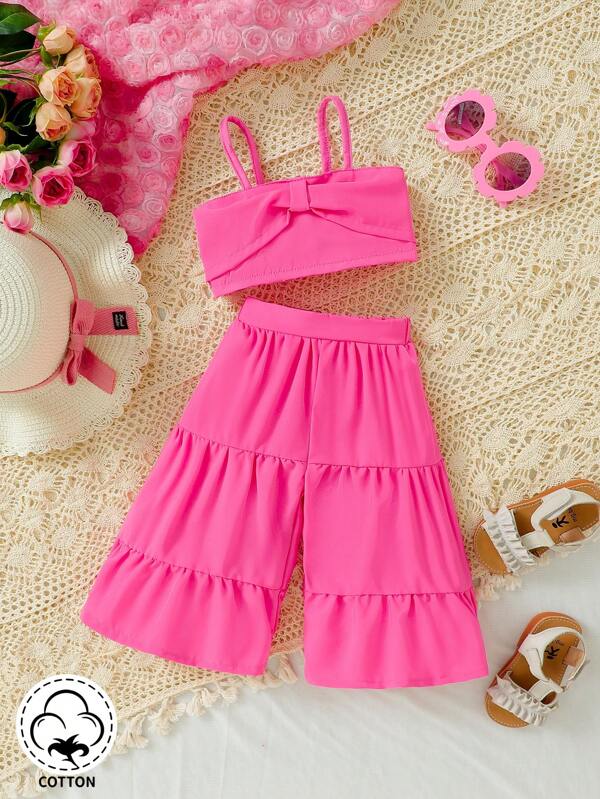 SHEIN 2-Piece Baby Girl And Child Leisure And Holiday Elegant Rose Red Suspender Flared Pants Suit Suitable For Going Out