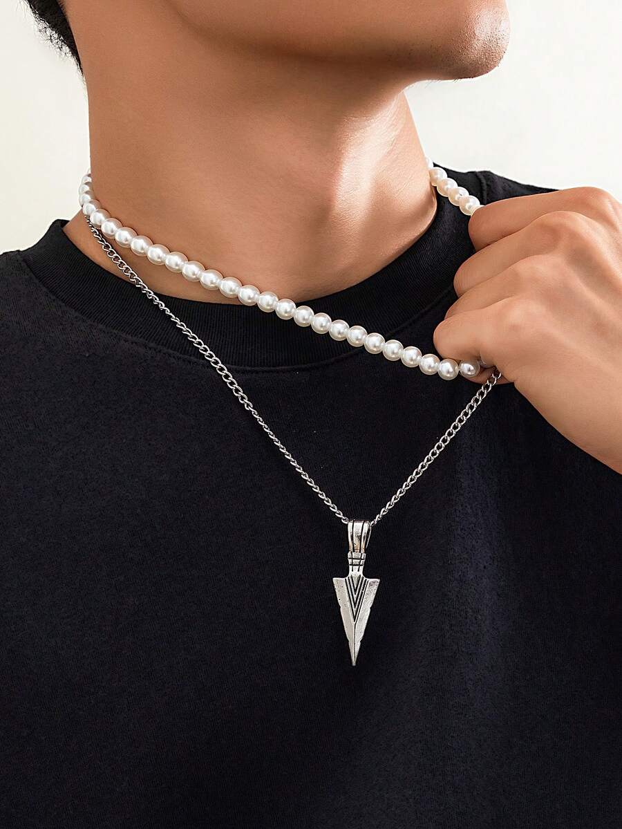2-Piece Fashionable And Creative Geometric Arrow Pendant Pearl Necklace Set For Men'S Daily Casual Wear