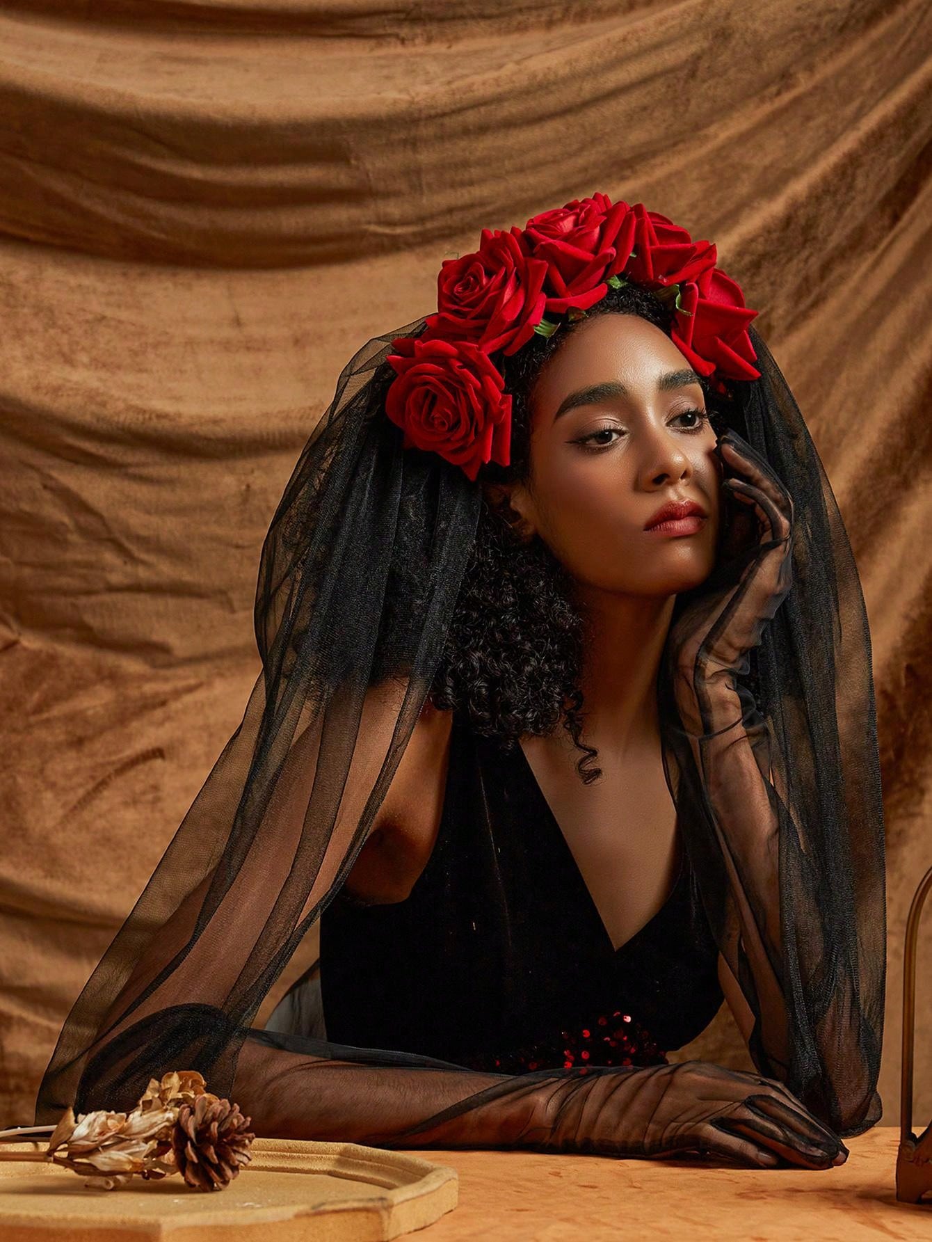 2-Piece Glove Hair Accessories Prom Party Gothic Garland With Black Veil Headband Cosplay Bridal Wedding Headwear Accessories