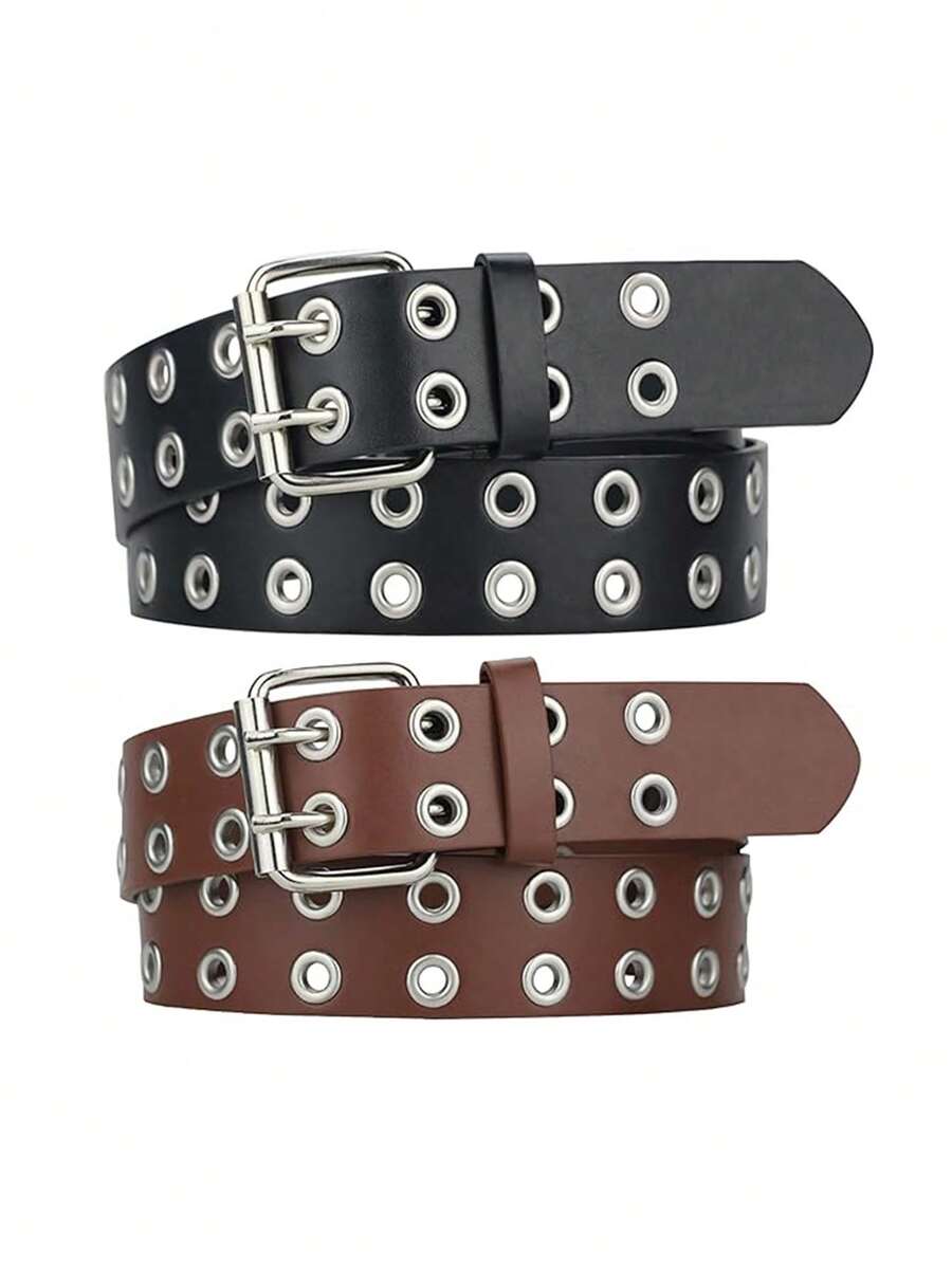 2 Pieces Of Women'S Fashion Versatile Punk Double Pin Buckle Belt Double Vent Eyelet Jeans Skirt Belt
