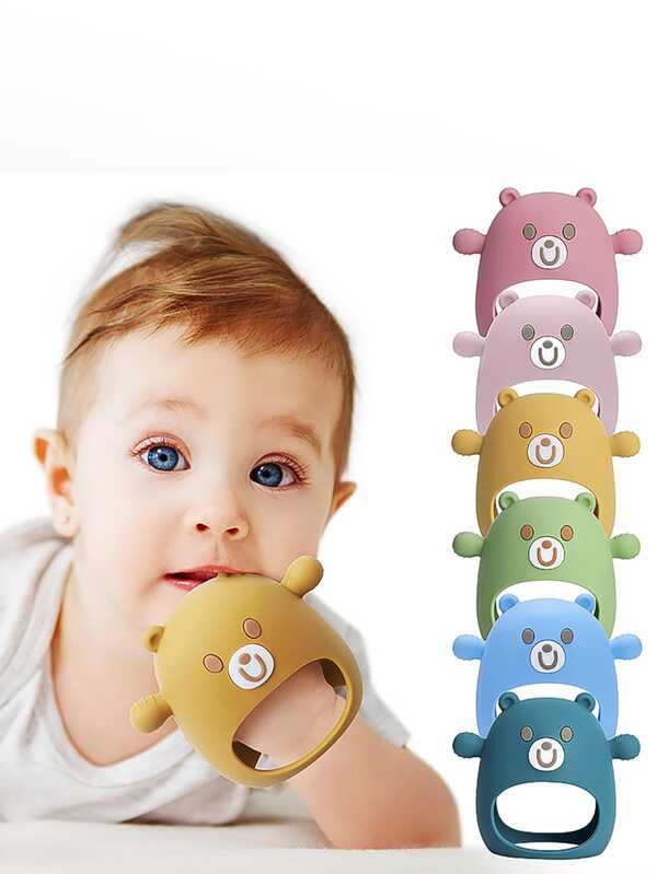 2-in-1 Blue Bear Shaped Baby Silicone Mitten Teether With Detachable Teething Toy, Soothing Pain Relief Protection Glove Teether