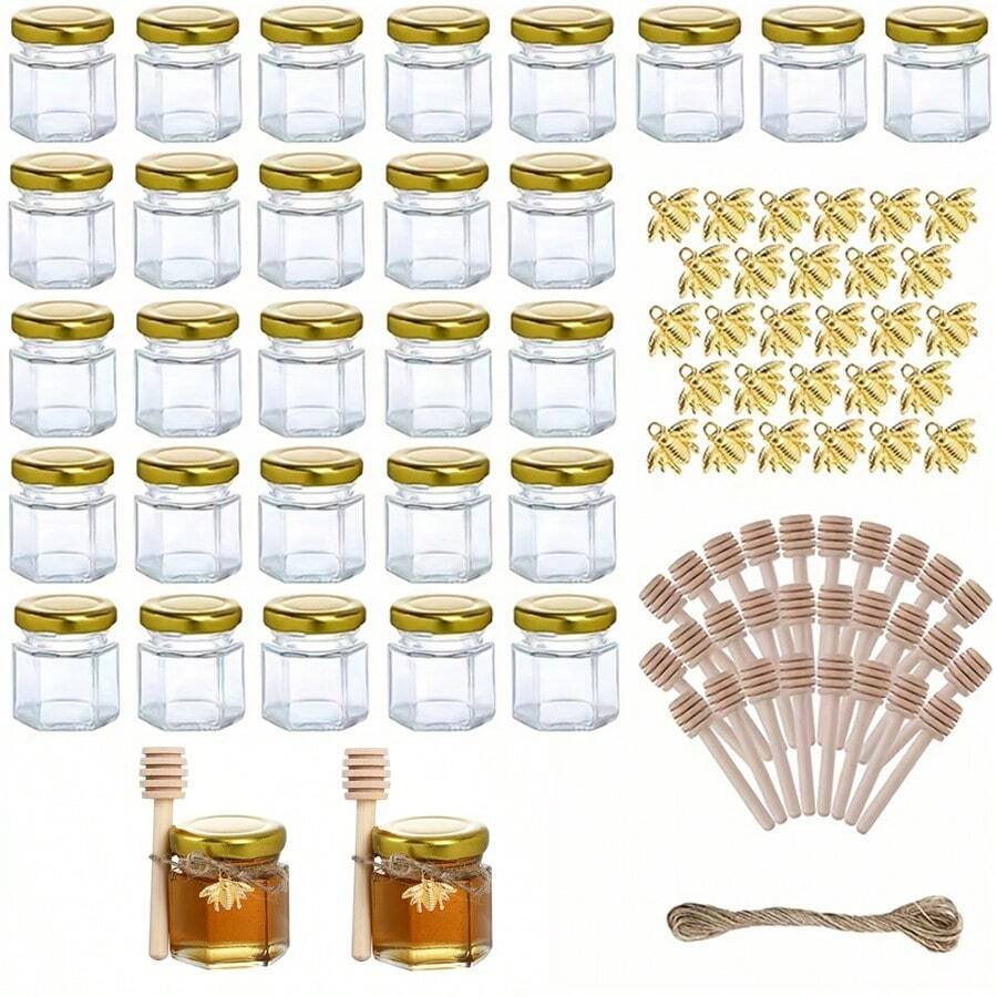 20/30pcs Mini Honey Jars, Hexagon Little Glass Honey Jar With Golden Lids, Wooden Dippers, Bee Charms And Jutes, Small Honey Jars, Useful Tool, Kitchen Stuff
