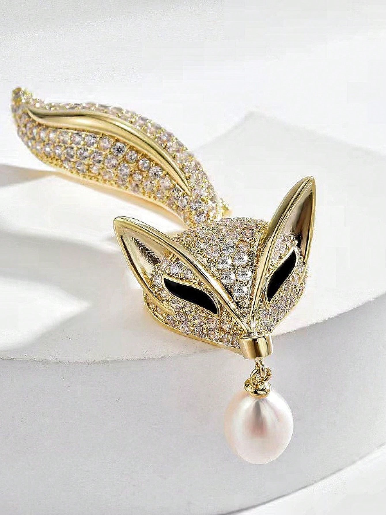 2024 Fashion Madeline Designer & Pearl Decor Handmade Pure Copper Brooch In Golden Fox Shape, Suitable For Parties, Jumpers & Street Style