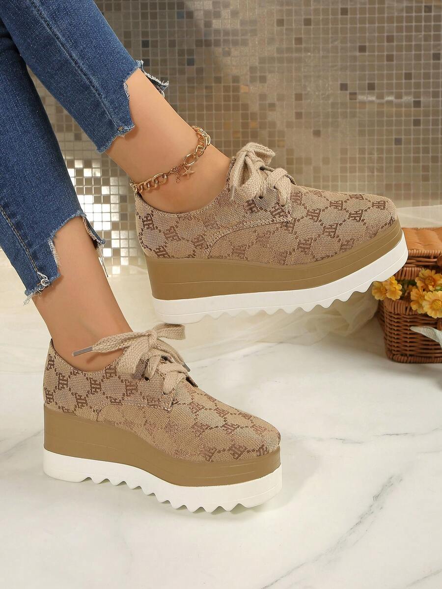 2025 Women's New Dual-Color Sole Platform Shoes, Round Toe Lace-Up Casual/Athletic Style Shoes, Black, Thick Sole, Wedge Heel, Height Increasing, Suitable For Autumn