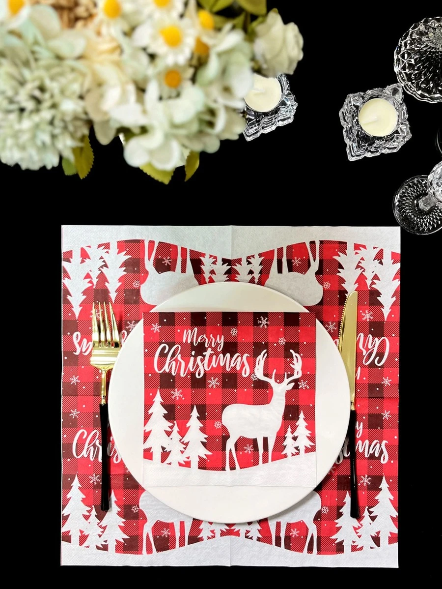 20pcs Red Plaid Reindeer & Merry Christmas Party Napkins, -friendly Wood Pulp Festive Dr Paper Towels