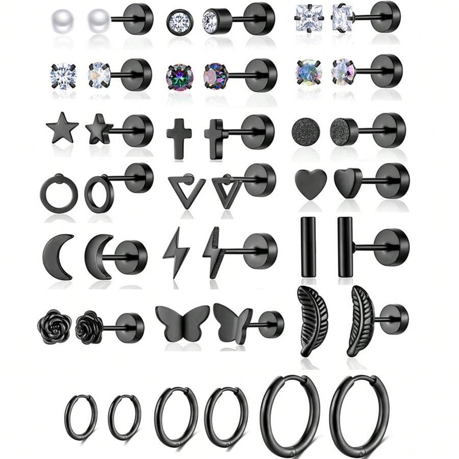 21pairs/Set Black Earrings Combo Including Stainless Steel Flat Back Earrings, Surgical Steel Earrings, Cz Cartilage Earrings, Multi Cuff Earrings For Both Men And Women