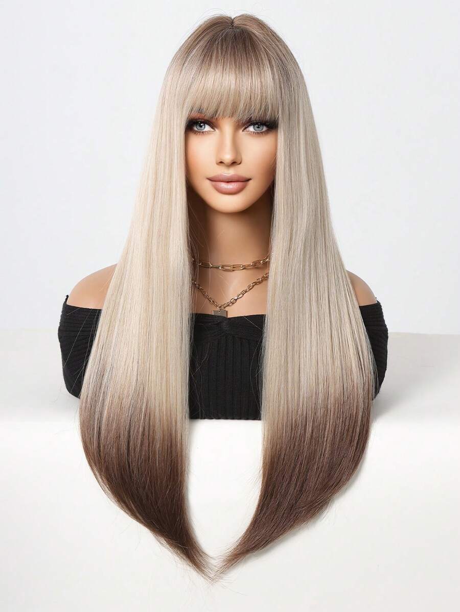 24 Inch Long Straight Ombre Brown To Blonde Wig With Bangs Heat Resistant Synthetic Wigs For Women Hair Party Daily Cosplay Ombre Synthetic Wig Make Natural Looking Wigs For Women
