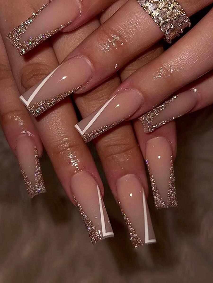 24pcs Medium Coffin Glitter French Nail Art Full Cover Artificial Fake Nails Wearing Reusable False Nails Ballerina Press on Nail Art& 1sheet Tape & 1pc Nail File