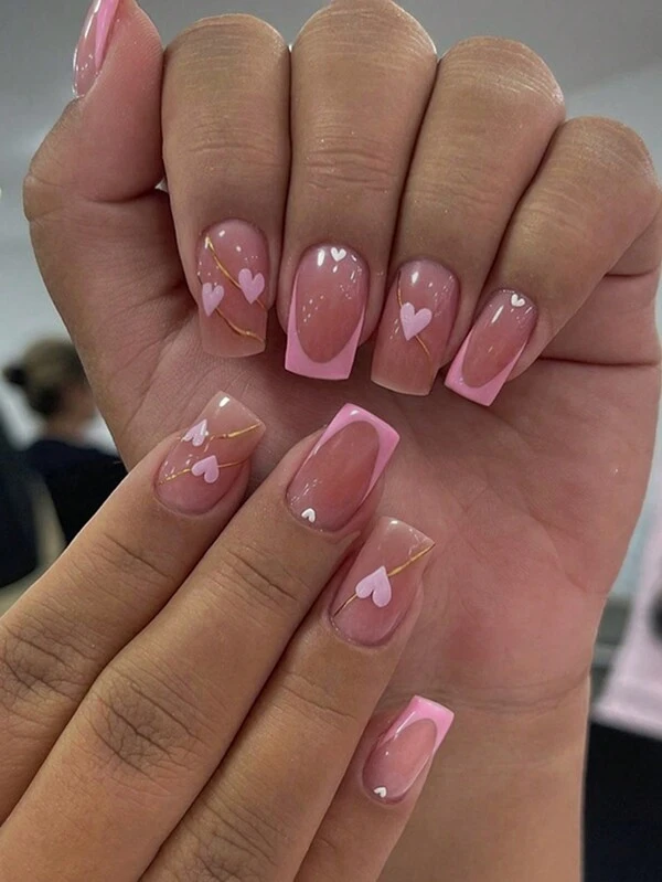 24pcs Medium-Long French Style Pink & Gold Thread Heart Shaped Nail File With Square Top, Jelly Gel & Cuticle Pusher Set For Sweet Girls' Ins Style