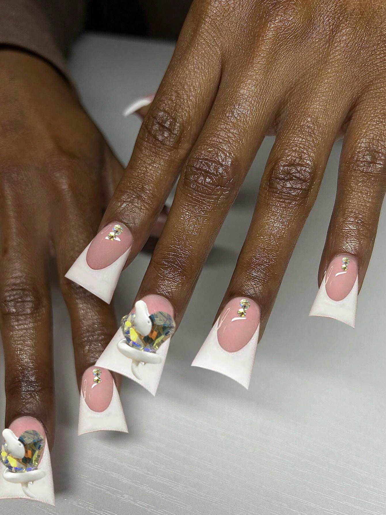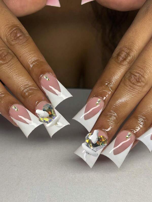 24pcs Press On Nail Long Duck Nails Tips White French With 3D Snake & Heart Shape Rhinestone Decorate,Reusable Soft Gel Stick On Nails In 12 Sizes, Contain 1pcs Jelly Glue And 1pcs Nail File, For Nail Art By Women & Girls