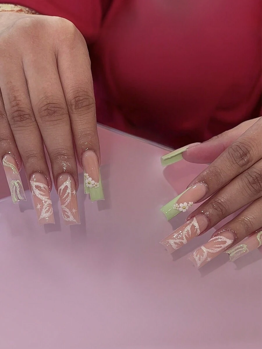 24pcs Press-On Nail Tips In Long Coffin Shape, Pink And Green Color With French Tips, Flowers, Sparkles, And Butterflies, Suitable For New Year'S Gift, Including 1pc Nail File And 1pc Jelly Gel