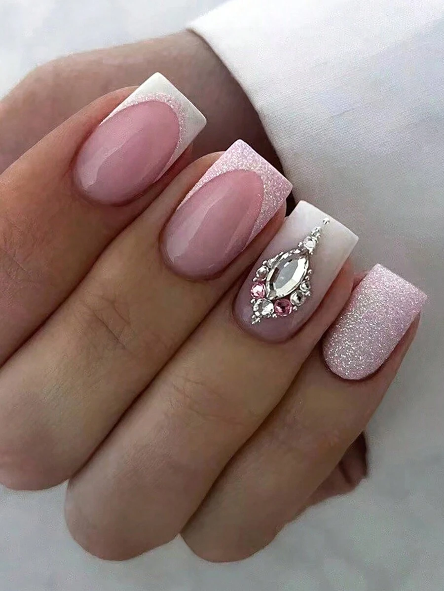 24pcs/Set Short Square-Shaped French Gradient Pink & White Glitter Rhinestone False Nail Tips For Nail Art