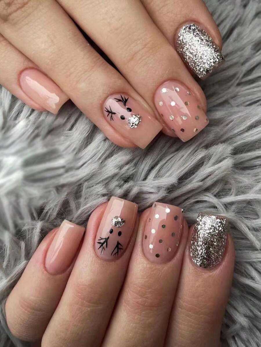 24pcs/set Christmas Deer Patterned Square Short False Nails Glittering Silver Reusable Press-on Nail Kit For Daily And Festival Wear