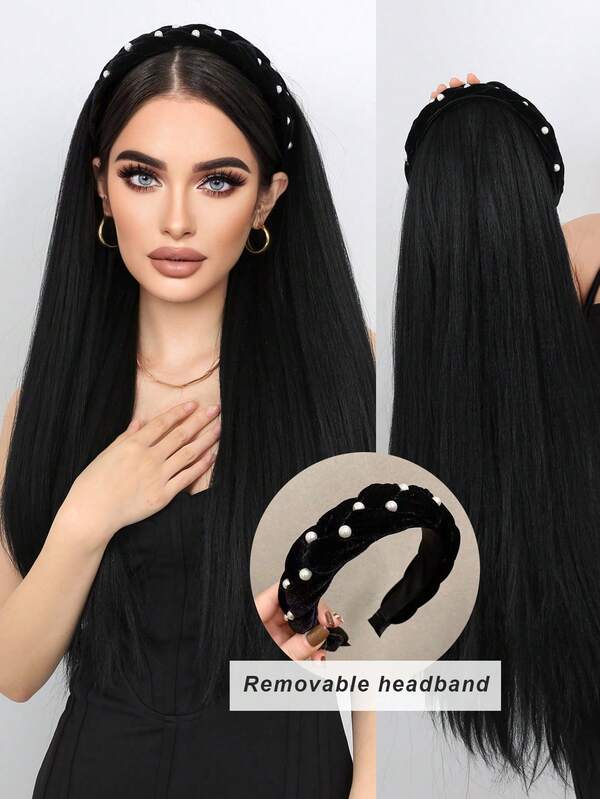 26 Inch Jacques Long Straight Hairpiece Removable Headband Wig Black Synthetic Fiber Women'S Fluffy Natural Heat-Resistant Synthetic Wig Suitable For Daily Wear