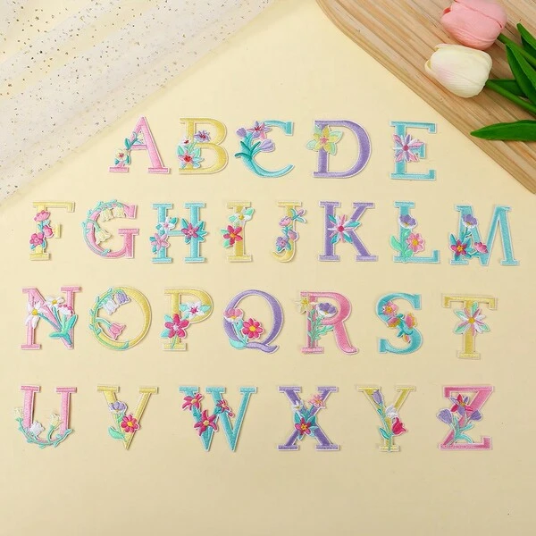 26pcs Flower & Letter Design Fabric Stickers For Clothing, Romantic Style Accessory