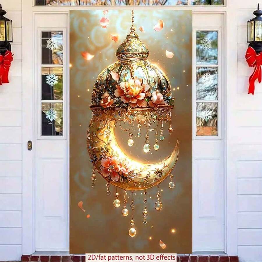 2D Polyester Ramadan Door Banner 1pc Exquisite Moon - Shaped Hanging Ornament With Floral Embellishments And Crystal Dangles Eid Al-Fitr Photo Props And Supplies, Suitable For Muslim Ramadan And Eid Al-Adha Celebrations, Islamic-Themed Holiday Decorations