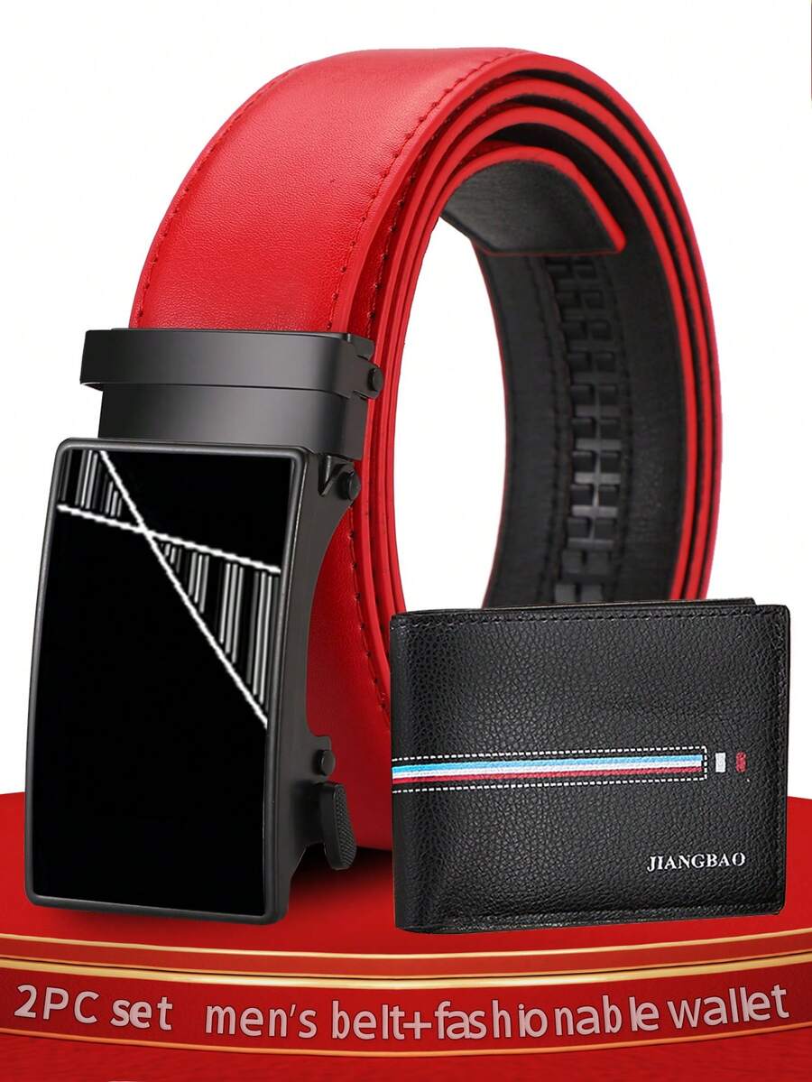 2PCS Men'S Belt+Wallet Set New Red Belt Business Fashion Casual Black Accessories PU Automatic Buckle Jeans Multifunctional Belt Christmas Gift For Dad, Boyfriend, Brother, And Husband, Youth Birthday Belt