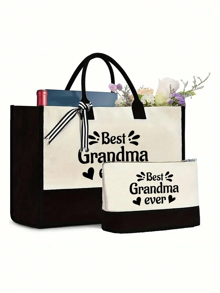 2Pcs Best Grandma Ever Reusable Canvas Tote Bag Gift for Grandmother from Grandchild, Mothers Day Gifts for Grandma, Grandma Gifts Ideas Handbag for Nana, Grandmother Birthday Gifts for Grandma, Great Grandma Gifts from Grandchild, High-Capacity Tote Bag, Gift For Mom, Personalized Bithday Thanksgiving Retirement Christmas Gifts for Women, Book Tote Bag, Trendy Letter Print Tote Bag Set, Large Capacity Tote Bag & Coin Bag, Perfect Handbag For Shopping