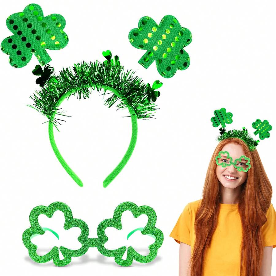 2Pcs St. Patrick'S Day Headband Shamrock Headband Glasses Set For Green Theme Parties And Even St Patricks Day Parades, Stage Props And Other Important Occasions
