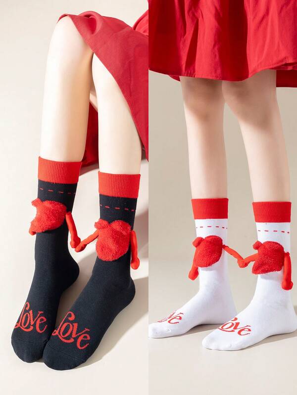 2pairs Unisex Couple Socks With Heart & Hand Shaped Design, Valentine'S Day Gift