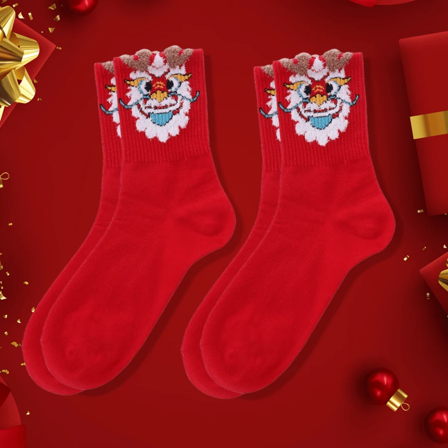 2pairs/Set Chinese New Year Dragon Zodiac Red Socks, Cartoon Embroidered Character Pattern High Waist Women'S Mid-Calf Socks