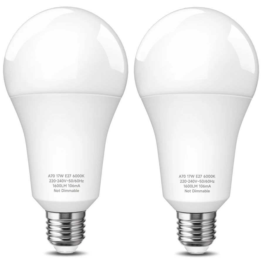 2pcs A70 17w Led Light Bulb With Bright 6000k Cool White Light, E27 Base, Non-Dimmable, Super Bright 1600 Lumens, Durable Plastic Package Aluminum, Multi-Purpose Household Lighting