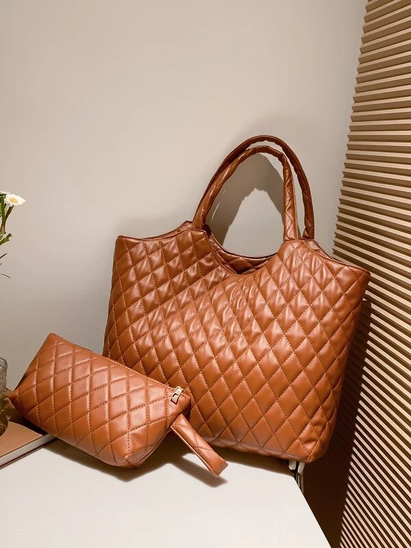 2pcs Argyle Quilted Shoulder Tote Bag With Wristlet Bag, Best Work Bag For Women
