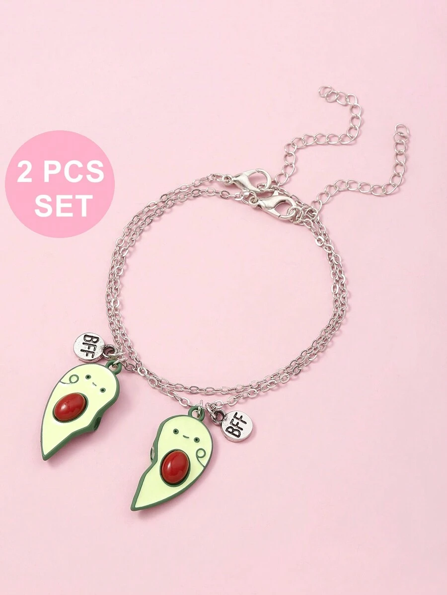 2pcs Avocado Shaped Friendship Bracelets Set With Heart Shaped Pendant For Girls, Alloy Bff Bracelets, Suitable As Gift For Best Friends, Bestie, Sisters