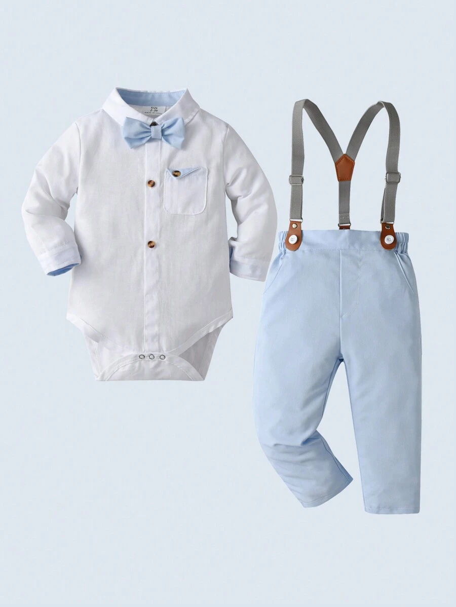 2pcs Baby Boys' Gentlemen Style Outfit With White Long Sleeve Shirt And Short Overalls With Bow Tie Detail, Suitable For Birthday, Party, Wedding, Baptism, Anniversary