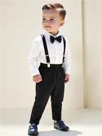 WimblieSHEIN 3pcs Baby Boy Formal Gentleman Outfit: White Collar Long Sleeve Shirt With Bowknot, Elastic Waist Suspender Pants And Gentleman Hat, Fashionable And Stylish, Suitable For Birthday Party, Evening Party, Wedding, Wedding Guest, Ring Bearer, Page Boy, Spring & Autumn, Best Choice For 6 Months To 3 Years Old Boys, Infant Wedding Gentleman Set Back To School Season Fall Winter #3 Bestseller