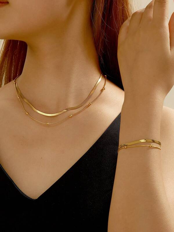 2pcs Bohemian Style Braided Flat Chain Copper Necklace And Bracelet Set For Women'S Daily Wear Or Party Costume
