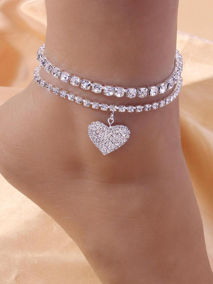 2pcs Fashionable Cute Double Layer Heart Shaped Rhinestone Ankle , Suitable For Girls' Dating Outfits
