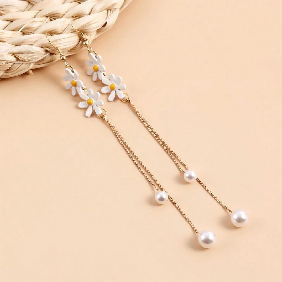 2pcs Fashionable Imitation Pearl & Daisy Flower Design Long Earrings, All-Match Dangling Ear Accessories