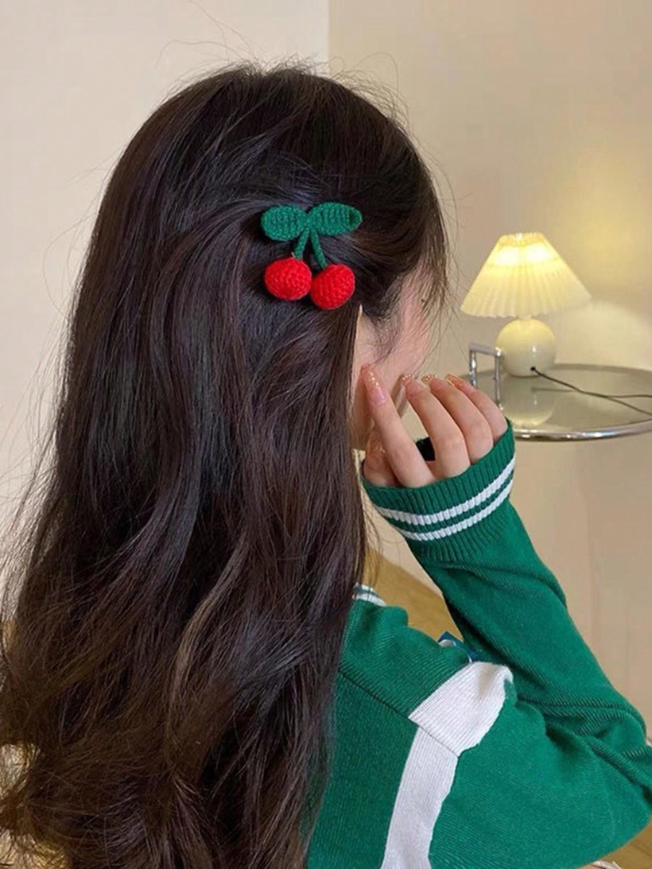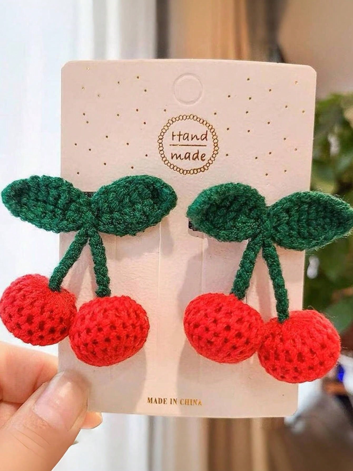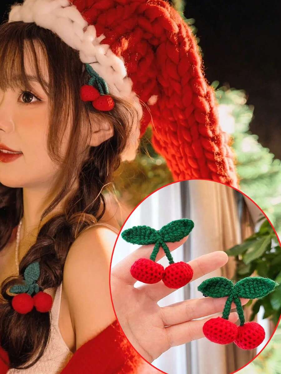 2pcs Festival-Themed Hair Accessories Wool Cherry Hair Clip For Women, Cute Duckbill Clip & Hairpin Set