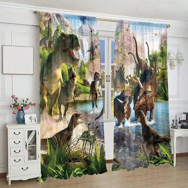 2pcs Forest Jurassic Dinosaur Scenery Printed Polyester Fabric Wall Tapestry Suitable For Living Room, Children's Room, Bedroom, Study, Kitchen, Storage Room Home Decoration