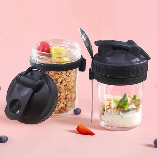 2pcs Glass Overnight Oat Cup Set With 2 Cups, 2 Spoons, Leakproof And Reusable For Overnight Oats, Milk, Yogurt, Granola And Breakfast, 350ml Capacity