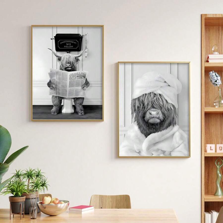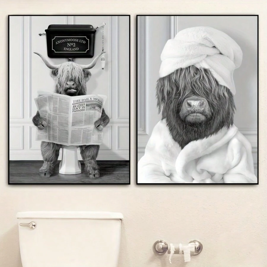2pcs Highland Cow On Toilet Poster - Funny Bathroom Wall Art Canvas Painting With Newspaper And Animal Towel - Black And White Photo Poster For Toilet Wall Decor - Frameless