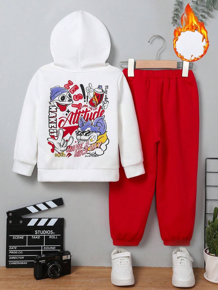 SHEIN Kids HYPEME 2pcs Little Boys' Leisure College Style Letter Cartoon Graffiti Slogan Pattern Hoodie And Sports Pants Suitable For Street And School Scenes, Autumn And Winter